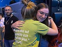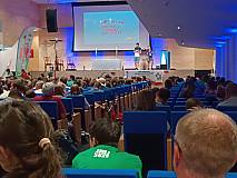 Nach einer kurzen Begrüßung durch die zwei Moderatorinnen aus dem Bistum Fulda fand ein kleine Kennenlernrunde statt. Mit Fragen wie ,,Wo ist das Bistum Trier, wo sind die Pilgernde aus Fulda“ oder ,, Wer ist zum ersten Mal beim Weltjugendtag mit dabei?“ kam ein bisschen Bewegung in die Runde. Anschließend folgt eine Einleitung und eine kurze Lesung aus dem Lukasevangelium zum Motto, das über dem WJT steht: ,,Maria stand auf und machte sich eilig auf den Weg.“ Was braucht es, dass ich eilig aufstehen und mich auf den Weg mache? Für wen oder was stehe ich auf? Über diese Fragen kam es zum ersten Austausch mit den Sitznachbarinnen und Sitznachbarn.