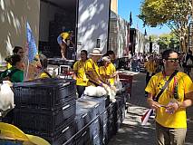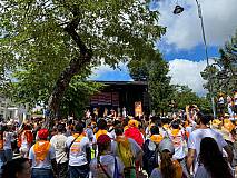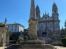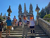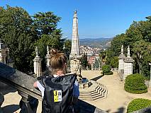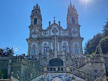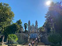 So ging es für uns nach dem Frühstück in einen größeren Ort namens Papa Quintela. Dort trafen wir uns mit allen jungen WJT-Pilgernden aus der ganzen Welt, die in unserem Gastbistum Lamego die Tage der Begegnung verbringen – von Amerika über Frankreich bis hin zur Ukraine! Das dortige Diözesantreffen war eine Art Festival: Mit so vielen Menschen in so einer tollen Partystimmung mit portugiesischer und christlicher Musik vereint zu sein, das kann man nicht beschreiben! Auf jeden Fall hat es uns einen, wenn auch nur geringen, Vorgeschmack auf Lissabon nächste Woche gegeben. Dem gemeinsamen Mittagspicknick auf einer großen Wiese folgte unsere Weiterfahrt nach Lamego. Hier war vor allem eine wunderschöne Marien-Wallfahrts-Kirche auf einem Hügel mit einem gewaltigen Treppenaufgang zu bestaunen. Mit allen Nationen, die unter den Pilgernden in Lamego vertreten sind, haben wir noch eine gemeinsame Messe mit dem Bischof von dort gefeiert.