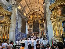 Tag des Abschieds, oder Aufbruch nach Lissabon. Heute früh haben wir uns nach einem letzten Frühstück auf den Weg Richtung Lissabon gemacht. Schon beim Abschied in Tarouca war zu spüren, wir hatten eine großartige Zeit. Danach sind wir erstmal nach Lamego aufgebrochen. Dort gab es noch einen großen Abschiedsgottesdienst für das ganze Bistum. Als das letzte Mal die Hymne verklungen war und wir unsere Lunchpakete eingesammelt hatten, hieß es Abschied nehmen und „Auf Wiedersehen“ sagen zu den Jugendlichen aus Tarouca.