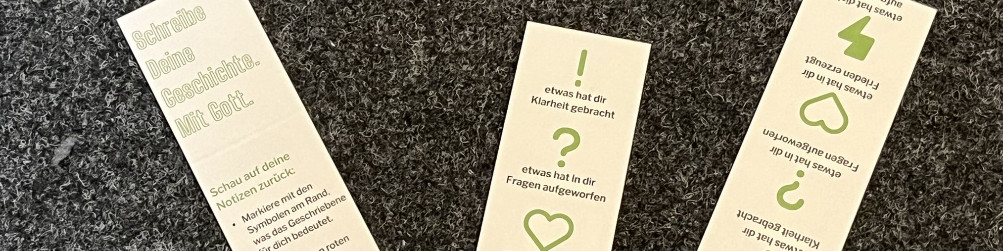 Schreibe deine Geschichte. Mit Gott. Die Anleitung auf dem Lesezeichen hilft dir deine Gedanken zu sortieren und reflektieren.